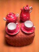 さてところで、世の中では食玩が流行してますが、無類のちいっちゃいもの好きの私とはいえ、あんまりはまってなかったのです。しかし、これにははまってしまいました。「ナタリーちゃんのフレンチ雑貨」というシリーズ。いやもう、私がリカちゃんで遊んでいたあのころにこれがあったらもう、たまったもんじゃねえな、っつーぐらいツボですよ。でもって、これは何故かコンビニやスーパーでは全く見かけたことなく、うめだホワイティ(梅田の地下街)にある雑貨屋さんでしか見たことがなかったのですが、行く度に1つずつ買って行きました。何故なら、赤字に白の水玉のティーセットがごっつい欲しかったからです。ようやく5回目でゲットいたしました! しかし「パリのキッチン(上記リンク先参照)」ってえのがだぶってしまいましたよ....。あと持ってるのは、「チーズ屋さん」と「ママのお気に入り」ってのです。次に欲しいのはミシンのついてるセットだなあ。