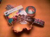 ってわけで今日の戦利品&前回のもの。手前はハリネズミのクッキー型、左上のは、ニコちゃんマークのスパンコール。何に使えばよいのかわかりませんが、かわいかったので。長いのがチロリアンテープ。右奥のは、前に「アンフェール」に行った時に買ったロシア製の木の小物入れ。フタにえれえ派手な金魚の絵が描いてあってかわいいのでした。