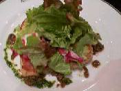 Tチーは、「鱈のブランダードのガレット サラダ添え」です。火を通した鱈とマッシュポテトを混ぜて、ガレットにして、アンチョビとバジルソースかな。これは真似したい感じ。