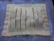 7.もう1枚のパイシートを同じように麺棒でやや伸ばし、半分に追って、端2センチほど残して1センチ幅に切り込みを入れる。