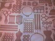 お裁縫柄なんですもの〜。お裁縫道具は可愛いやね〜。実はこのサイトのトップ、裁縫グッズデザインにしようとして挫折した過去が....。トップのタイトル部分だけ、ピンキングばさみのギザギザとステッチのみにその名残りがあるなあ。