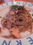 黒ゴマとエリンギのパスタ、にしました! これがペペロンチーノ黒ゴマ入り、って感じなんですが、おいしかったです。家でもいっぺん試してみよう。 |