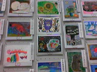 で次の日、また天王寺まで出かけてですね。天王寺公園の中の大阪市立美術館に行ってきました。 でまあ、「こども二科展」ですが、展示会場が地下で、おそらく1500点ぐらいが展示されてたと思います。1500人の子どもたちと、そのつきそいの家族で、あたりは騒然。しかも展示室のパネルに天井の高さまで絵がつり下がっている。あまりの大量の子どもの絵に、肝心のひーくんの絵がどこに展示されてるか全くわかんないのですよ。そんな中、私は4歳のハルくんの手を引いて、5ブースに仕切ってある展示会場を彷徨いました。キーワードは「豆まきの絵」「紫色の鬼」だと聞いてたので、それらしきものを探す。しかし全然なくて、「ひーくんの絵、どこやろねえ」と言いながら、ハルくんと目をきょろきょろさせ、最後のブースに辿り着く。ここにも見当たらない〜と思いつつぐるっと見てたら、ハルくんがいきなり「あ、ひーくんの絵あった」。そして彼の指差した先には。
