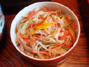 左、三の重。奮発しておいしい練り物を買ったら、やっぱり値段だけのことはあるわ。おいしいですよ。右、おなます。うちはサラダ仕立てです。ものすごい量の大根を千切りします。よかった、千切り好きで。