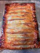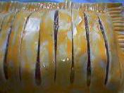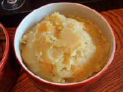 栗きんとん利用のポテトアップルパイです。栗きんとんに牛乳をかけて電子レンジでチンして、ようく混ぜた後に卵黄とバターを混ぜます。それと先日作った紅玉ジャムと一緒に冷凍パイシートで挟んで焼きました。これがとってもおいしかったですよ〜。熱いお紅茶にぴったりなお味でした。
