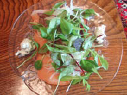 左、サーモンのサラダ。スパイスといっしょに練ったクリームチーズを添えました。右、うちの関西風白味噌のお雑煮。
