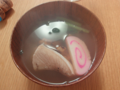 ふふふ、熱々なので湯気がたってますよ! これが博多風お雑煮。具はなると風蒲鉾、ブリ、小松菜で、お出汁がお昆布とおカツオとなんとスルメ!なんです。すごくおいしかった〜。先生ごちそうさまです。