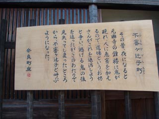 ということで、連絡所から奈良ホテルまでの裏道。「不審ケ辻子町」という不審な名前の場所です。したら、町名の由来の看板が。
