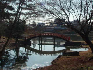 奈良ホテル側から、旧大乗院庭園を臨む。天気がイイので橋がくっきり。