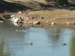 バス停から大乗院庭園を眺めたら、池にカモちゃんたちがおりましたよ。