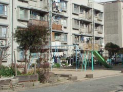 左の写真は、前のうちの横の通り、うちから南に100メートルほどの地点から。西宮の風景は、震災からこっち12年ですっかり変わってしまいましたが、この角度からだと殆ど変わってません。右のブロック塀の向こうには、市営住宅があって、そこの中庭にあるぶらんことすべり台と鉄棒!私の小さい頃のと同じのですよ。今もってちゃんと残ってるところがすごいなあ。