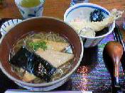 ミニ天丼とたぬきのセットです。ミニ天丼は母ちゃんとシェア。ちなみにこちらで「たぬき」つーたら、関東での「きつねそば」のことです。