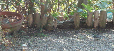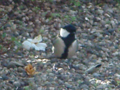 かーなり拡大してみました。下の白いのはサザンカの花が落ちたやつ。やっぱりシジュウカラってかわいいなあ。
