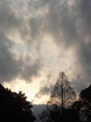 これは同じ神社の境内から、メタセコイアのシルエット。動画じゃないからわかんないけど、空の雲がものすごいスピードで東南から北西に流れていました。低気圧来てるなあと思ってたら、夜9時ぐらいから雷どっか〜ん! 現在夜中、風がとってもきついです。
