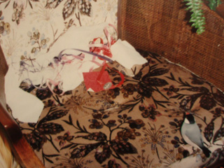 で、その目的地。それは椅子のクッションの裏だったのです。えええ?と思ってクッションをどけてみましたら。