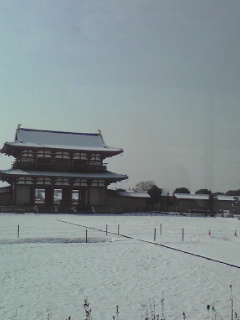 って感じで、月曜日は寝て暮してました。で、今日は4時の京都行きに乗って帰ってきたわけですが、前に坐っていた出張帰りと思しきサラリーマンたちが、窓の外を見ながら、「奈良って、結構都会ですよね〜」とかなんとか。曲がりなりにも県庁所在地、しかも日本で最初の都のあったお土地柄なんですけどね。さらに平城京跡を見ながら、「これは公園なんですかね〜」。朱雀門見ながら、「なんかの復元ですかね〜」「歴史ある街って感じですね〜」....ってオイ。ここは1300年前は、今で言うところの東京丸の内あたりだと思いますが....。まあ、今は昔の風景ですけど。