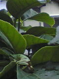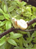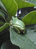 ☆おともだち で、今日、ちょうど雨がぱらつき始めたところでうちに帰ってきたら、玄関の脇でケロコの声が。しかし、なんか上の方で声がする〜。と思ったら、ケロコってば、シラカシの木の上の方の葉っぱの上にいるではありませんか〜。お尻がこっち向いてるけど、ちょうどほっぺを膨らませてケロケロゆーてるところが撮れました。